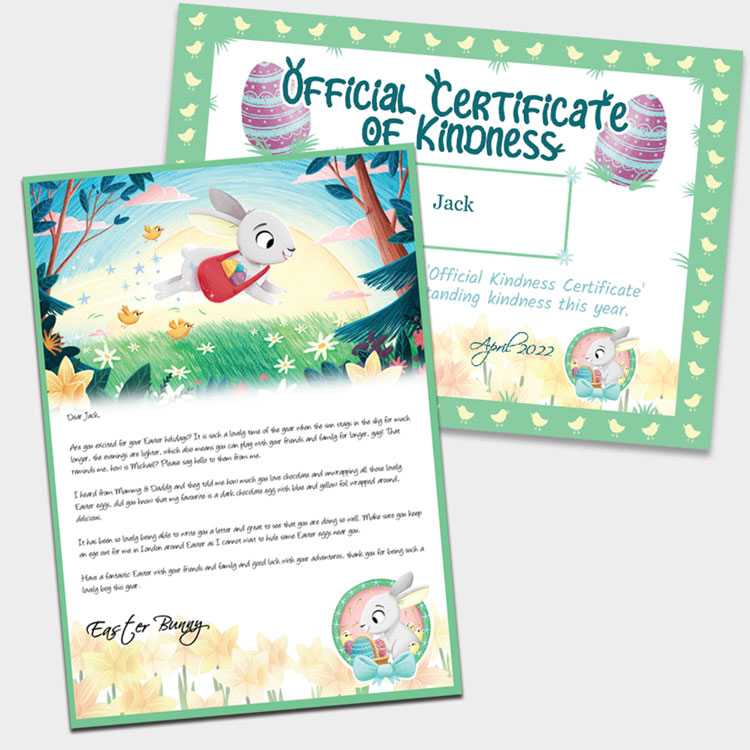 Each letter from the Easter Bunny is personalised includes an official kindness certificate, printed, posted and then delivered direct to your child in an Easter envelope.