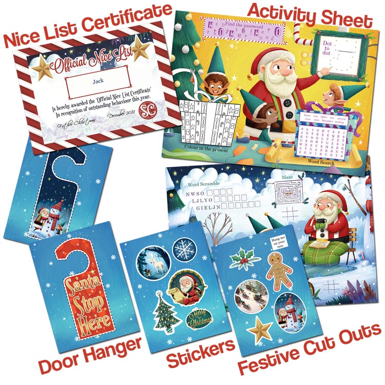 Section 8: Santa's Official Nice List Certificate, Activity Pack including a Santa Stop Here Door Hanger, Festive Stickers, Christmas Decorations Cut Outs plus a text message from Santa on Christmas Day